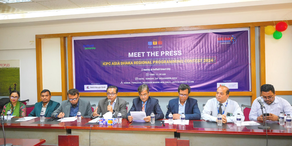 মো. মনজুরুল ইসলাম (মনজু) : ড্যাফোডিল ইন্টারন্যাশনাল ইউনিভার্সিটির সার্বিক তত্ত্বাবধায়নে আগামী ৭ ডিসেম্বর (শনিবার) সাভারের ড্যাফোডিল স্মার্ট সিটি ক্যাম্পাসের স্বাধীনতা সম্মেলন কেন্দে অনুষ্ঠিত হতে যাচ্ছে, আন্তর্জাতিক মর্যাদা সম্পন্ন প্রোগ্রামিং প্রতিযোগীতা আইসিপিসি-ইন্টারন্যাশনাল কলেজিয়েট প্রোাগ্রামিং কনটেষ্ট) এর ঢাকা আঞ্চলিক পর্ব। প্রতিযোগিতার আয়োজন এবং এর বিশেষত্ব নিয়ে আজ ২৪ নভেম্বর (রবিবার) ঢাকা ‘জাতীয় প্রেস ক্লাবে’ আয়োজিত “মিট দ্যা প্রেস” অনুষ্ঠানে বিস্তারিত তথ্য তুলে ধরা হয়।