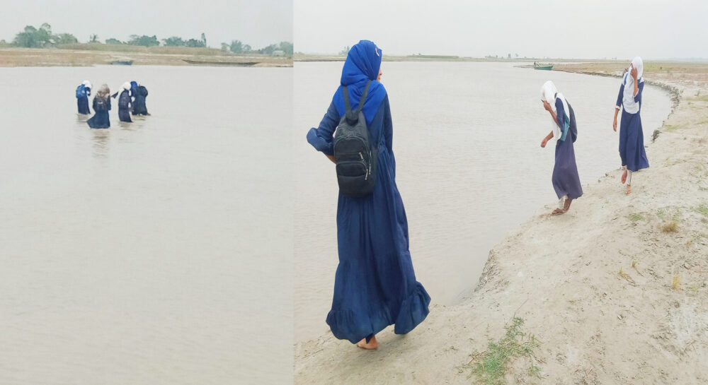 নীলফামারী জেলার ডিমলা উপজেলার দোহল পাড়া আদর্শ স্কুল এন্ড কলেজের শিক্ষার্থী ১০ শ্রেনির মাহামুদা, ৮ম শ্রেনির ঝড়না, ৭ম শ্রেণির আঞ্জু বলে, নদীতে পানি নাই বলে নৌকা চলে না, তাই আমারা এভাবেই নদী পর হয়ে স্কুলে যাই-আসি। আমাদের সবার বাড়ি কিসামত ছাতনাই চরে।