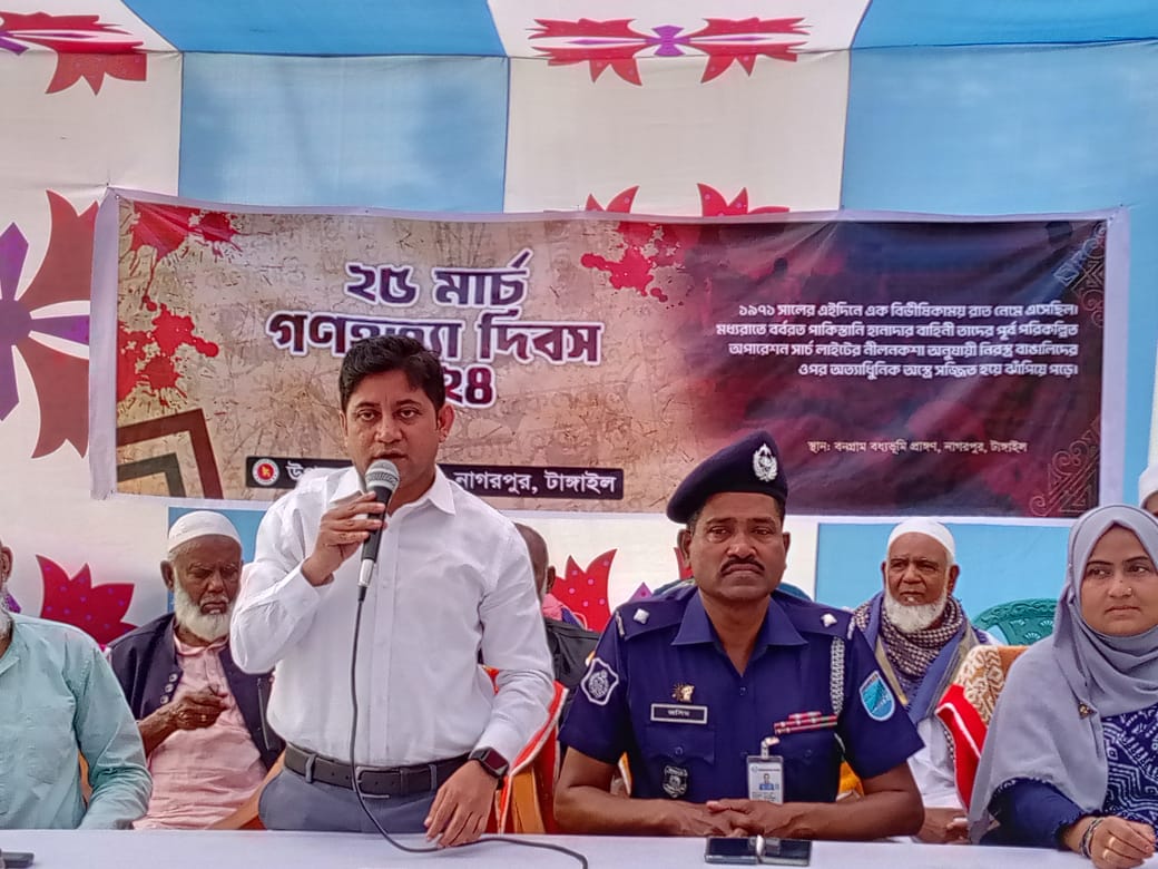 মো. তোফাজ্জ্বল হোসেন তুহিন, সিনিয়র স্টাফ করেসপনডেন্ট, নাগরপুর, টাঙ্গাইল : টাঙ্গাইলের নাগরপুরে গণহত্যা দিবস পালিত হয়েছে। দিবসটি উপলক্ষ্যে আজ ২৫ মার্চ সকালে নাগরপুর উপজেলার বনগ্রাম গণ কবরে উপজেলা প্রশাসন, মুক্তিযোদ্ধা, শহীদ মুক্তিযোদ্ধা পরিবারসহ গ্রামবাসীর পক্ষ থেকে শহীদ মুক্তিযোদ্ধাদের স্মরণে শহীদ স্মৃতিস্তম্ভে পুস্পস্তবক অর্পণ ও শহীদ মুক্তিযোদ্ধাদের প্রতি দোয়া করা হয়।