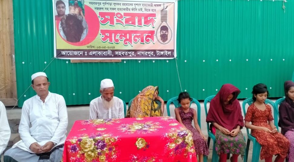 মো. তোফাজ্জ্বল হোসেন তুহিন, সিনিয়র স্টাফ করেসপনডেন্ট, নাগরপুর, টাঙ্গাইল : গাছ কাটাকে কেন্দ্র করে আলোচিত লুৎফর হত্যার প্রকৃত খুনিদের বিচার চেয়ে সংবাদ সম্মেলন করেছেন নিহতের পরিবার। শুক্রবার নিহত লুৎফরের নিজ বাড়িতে এ সংবাদ সম্মেলনের আয়োজন করা হয়। সম্মেলনে নিহত লূৎফরের বাবা মো. আশরাফ আলী ও মা আউশি বেগম বলেন , আমার ছেলেকে সহবতপুর ইউনিয়নের শালিয়ারা গ্রামের ময়নাল সিকদারের ছেলে নজরুল ও তার লোকজন পরিকল্পিতভাবে হত্যা করে। আমরা এই হত্যাকান্ডের বিচার চাই। সংবাদ সম্মেলনে উপস্থিত নিহত লুৎফরের বড় উর্মী আক্তার ও ছোট মেয়ে লীমা আক্তার কান্নাজড়িত কণ্ঠে বলেন, আমরা আমাদের পিতার খুনিদের শাস্তি চাই। আর কোন ছেলে মেয়ে যেন আমাদের মত এতিম না হয়। নিহতের স্ত্রী হুছনা বেগম সংবাদ সম্মেলনে প্রশাসনের কাছে পরিবারের পক্ষ থেকে প্রকৃত দোষীর সর্ববোচ্চ শাস্তির দাবী করেন।