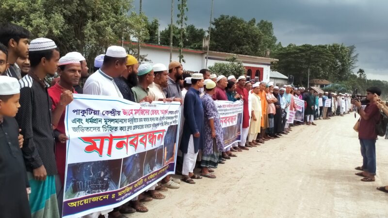 মসজিদ কমিটির সভাপতি মো. শাজাহান খানের সভাপতিত্বে ও কাজী আবু বক্কর সিদ্দিকের পরিচালনায় মানববন্ধনে বক্তব্য রাখেন, পাকুটিয়া ইউপি চেয়ারম্যান বীর মুক্তিযোদ্ধা মো. সিদ্দিকুর রহমান সিদ্দিক, ইউনিয়ন আওয়ামী লীগের সাধারণ সম্পাদক মো. শামীম খান, মুফতি হারুন অর রশিদ, জামে মসজিদের সাধারন সম্পাদক মো. কহিনুর রহমান, মো. আব্দুস সালাম খান, প্রভাষক মো. হুমায়ুন কবির, মো. মোনায়েম খান, মো. রুহুল আমিন খান, মো. মাসুদ পারভেজ প্রমুখ।