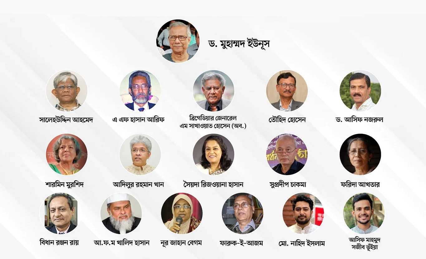 অন্তর্বর্তীকালীন সরকারের উপদেষ্টামণ্ডলীতে রয়েছেন বাংলাদেশ ব্যাংকের সাবেক গভর্নর সালেহউদ্দিন আহমেদ, ঢাকা বিশ্ববিদ্যালয়ের আইন বিভাগের অধ্যাপক ড. আসিফ নজরুল, মানবাধিকার সংগঠন অধিকারের সম্পাদক আদিলুর রহমান খান, সাবেক অ্যাটর্নি জেনারেল এ এফ হাসান আরিফ, সাবেক পররাষ্ট্রসচিব তৌহিদ হোসেন, বাংলাদেশ পরিবেশ আইনবিদ সমিতির (বেলা) প্রধান নির্বাহী সৈয়দা রিজওয়ানা হাসান, সাবেক নির্বাচন কমিশনার ব্রিগেডিয়ার জেনারেল (অব.) এম সাখাওয়াত হোসেন, বেসরকারি সংস্থা উন্নয়ন বিকল্পের নীতিনির্ধারণী গবেষণার (উবিনীগ) নির্বাহী পরিচালক ফরিদা আখতার, গ্রামীণ টেলিকমের পরিচালক নূর জাহান বেগম, বেসরকারি সংস্থা ব্রতীর নির্বাহী পরিচালক শারমিন মুরশিদ, ইসলামী চিন্তাবিদ আ ফ ম খালিদ হাসান, বৈষম্যবিরোধী ছাত্র আন্দোলনের সমন্বয়ক নাহিদ ইসলাম ও আসিফ মাহমুদ সজীব ভূঁইয়া, সাবেক রাষ্ট্রদূত সুপ্রদীপ চাকমা, জাতীয় মানসিক স্বাস্থ্য ইনস্টিটিউটের সাবেক পরিচালক বিধান রঞ্জন রায় পোদ্দার এবং বীর প্রতীক ফারুক-ই-আজম।