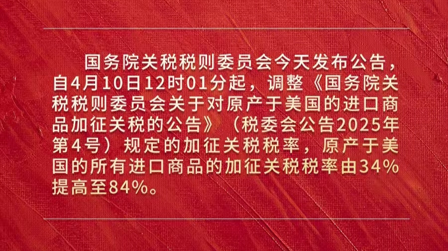 ঘোষণায় বলা হয়েছে যে, ২০২৫ সালের ৮ই এপ্রিল মার্কিন সরকার যুক্তরাষ্ট্রে রপ্তানি হওয়া চীনা পণ্যের উপর ‘সমতুল্য শুল্ক’ ৩৪ শতাংশ থেকে ৮৪ শতাংশে বাড়ানোর ঘোষণা দিয়েছে। চীনের উপর শুল্ক বৃদ্ধির মার্কিন পদক্ষেপ একের পর এক ভুল সিদ্ধান্ত। এটি চীনের বৈধ অধিকার ও স্বার্থের গুরুতর লঙ্ঘন করে এবং নিয়ম-ভিত্তিক বহুপাক্ষিক বাণিজ্য ব্যবস্থাকে মারাত্মকভাবে ক্ষতিগ্রস্ত করে।